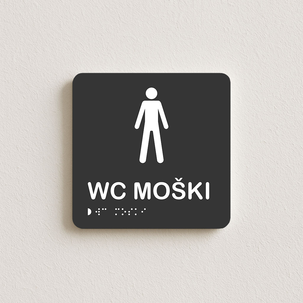 Tabla jasno označuje sanitarni prostor za moške. Vse table imajo reliefni tisk, kontrastne barve in Braillovo pisavo, kar omogoča prepoznavnost tudi slabovidnim in slepim osebam. Primerna je za javne, poslovne in pisarniške prostore.