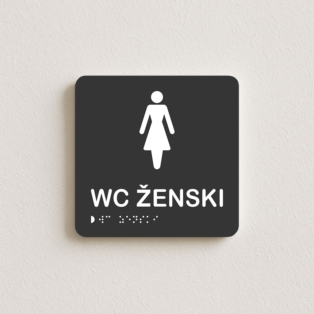 Tabla jasno označuje sanitarni prostor za ženske. Vse table imajo reliefni tisk, kontrastne barve in Braillovo pisavo, kar omogoča prepoznavnost tudi slabovidnim in slepim osebam. Funkcionalna, elegantna in jasna označitev zagotavlja preglednost in dostopnost prostora za vse uporabnike.
